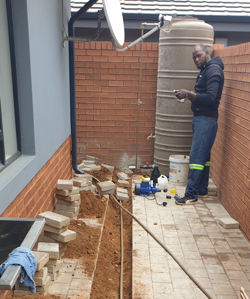 | Private Residence | Atlantis City, Sonneveld, Brakpan | Rainwater harvesting and water backup: 1x 5000L water tank 1x VSD water pump 1x concrete slab | “Thank you very much for your professional workmanship” |